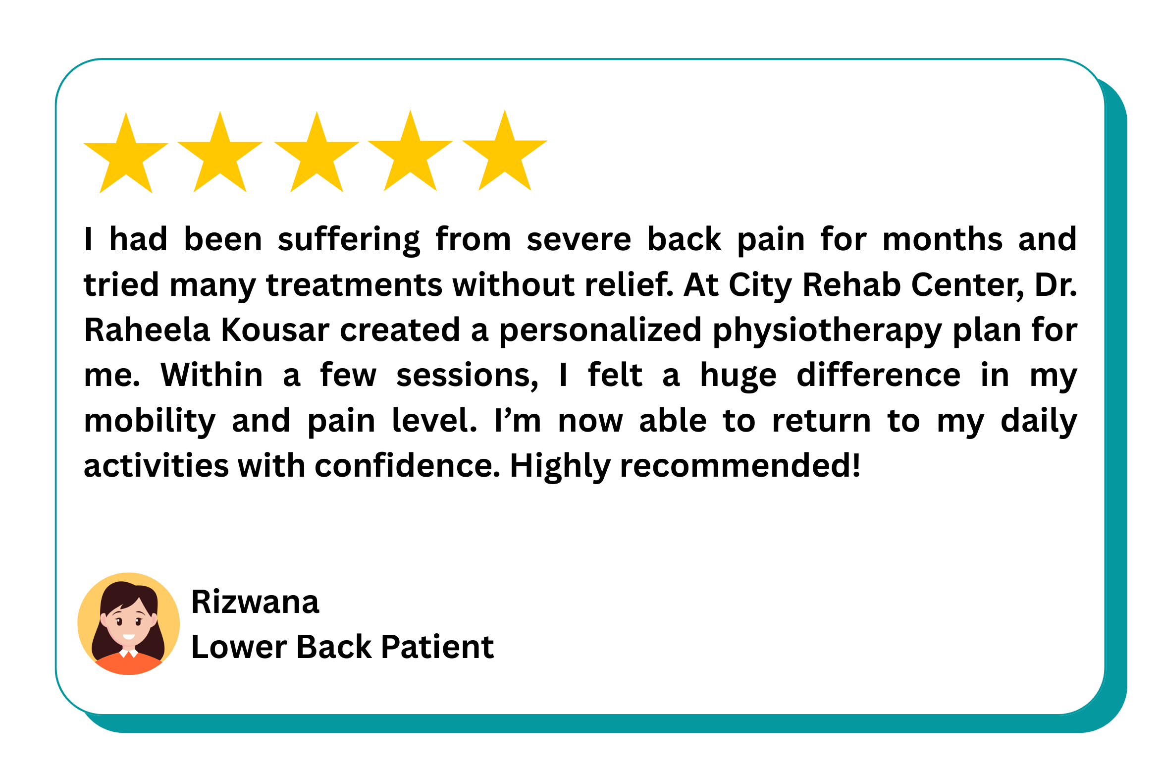 City Rehab Center – a trusted physiotherapy and rehabilitation clinic dedicated to helping patients overcome pain, regain mobility, and improve their quality of life. Under the care of Dr. Raheela Kousar, we provide personalized treatments designed to restore strength, enhance movement, and support long-term wellness.